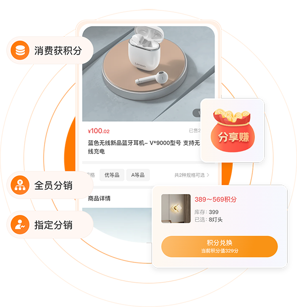 提供积分兑换功能,通过全员分销和指定分销员模式,增加复购率