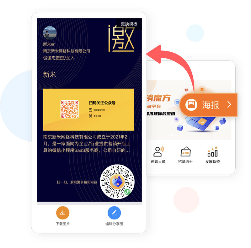 系统自动生成海报:无需专业设计,不管是活动还是小程序页面分享时用户都可以自动生成海报去转发推广;