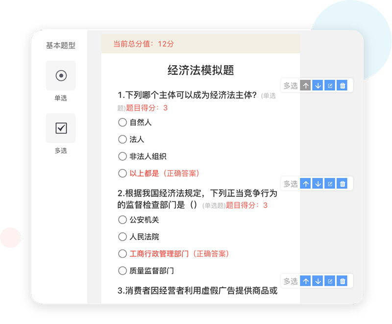 考题设置丰富:单选、多选、问答题自由设置
