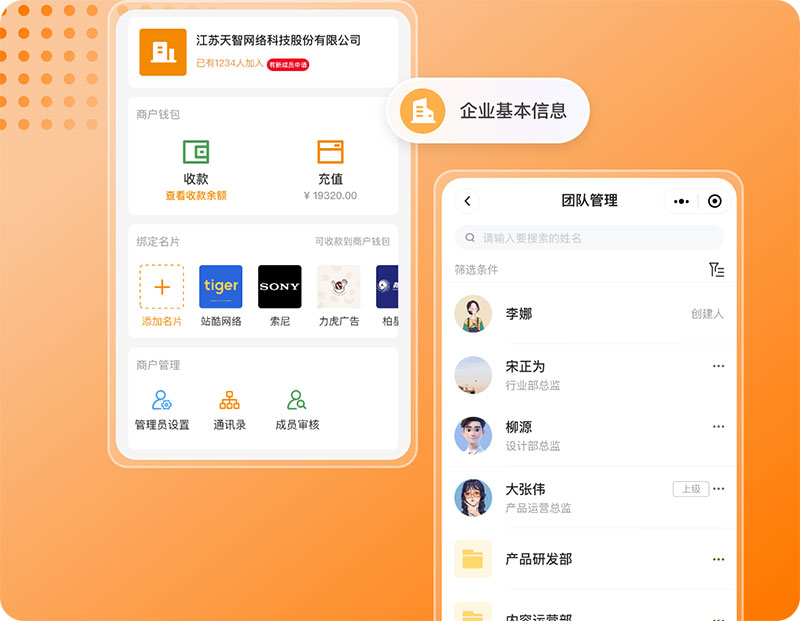 员工名片:员工名片上的内容由企业统一管理,员工不可修改,保证信息准确性
